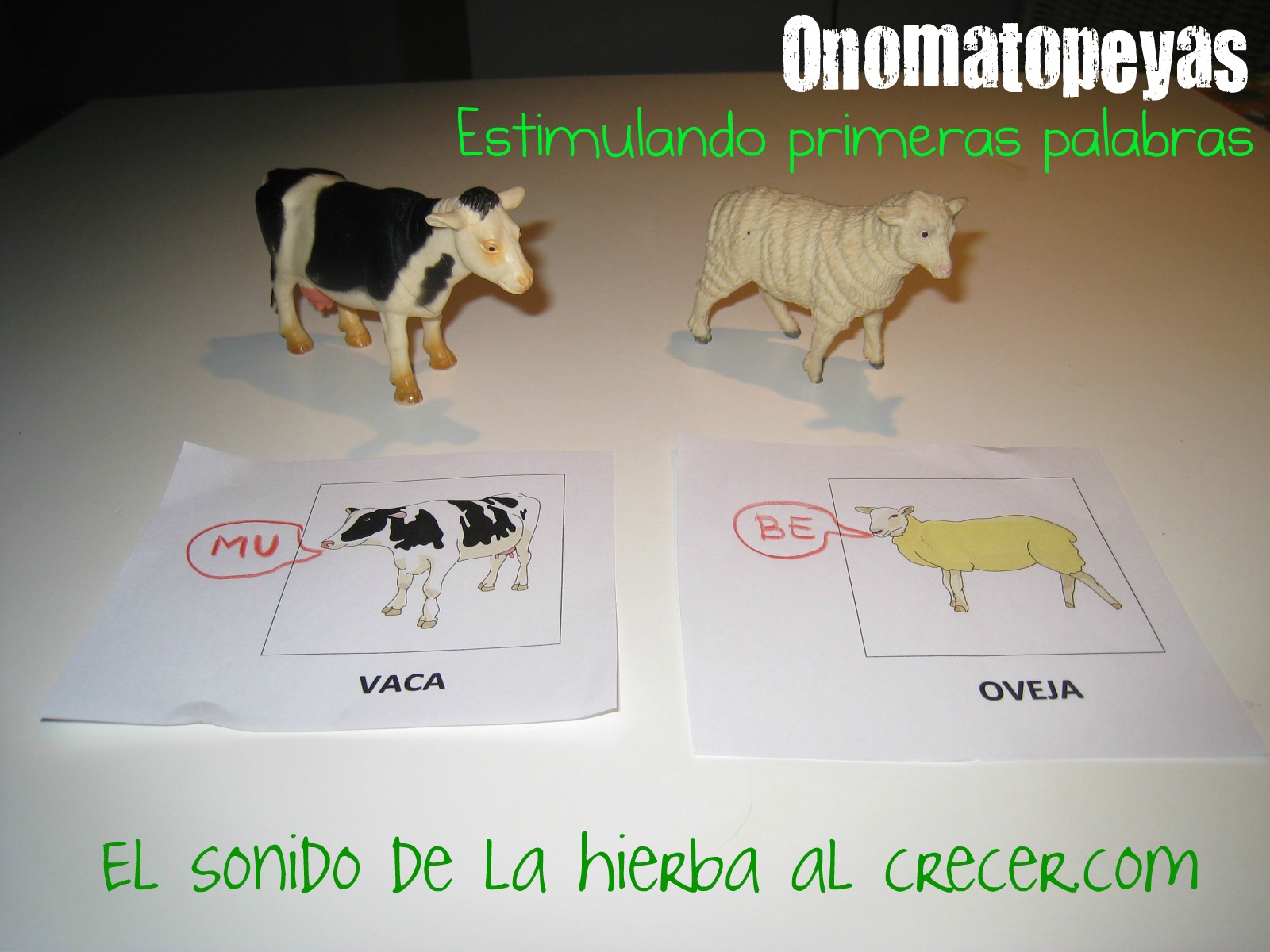 Más adelante utilizábamos figuras de animalitos o fotos. Se coge la figura del animal (vaca), se dice: “MU” y se da la orden: “di MU”. En cuanto el niño la repite, se le elogia y se le recompensa.