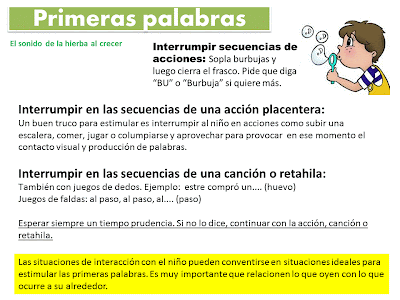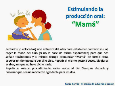 – y que los padres exijan al niño dicho lenguaje, es decir, intentar no anticiparnos a sus necesidades (si sabemos que el niño tiene sed, esperar que intente comunciarlo de alguna forma antes de darle el vaso de agua, por ejemplo. Eso sí, esperar sólo un tiempo prudencial).