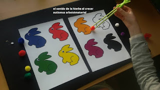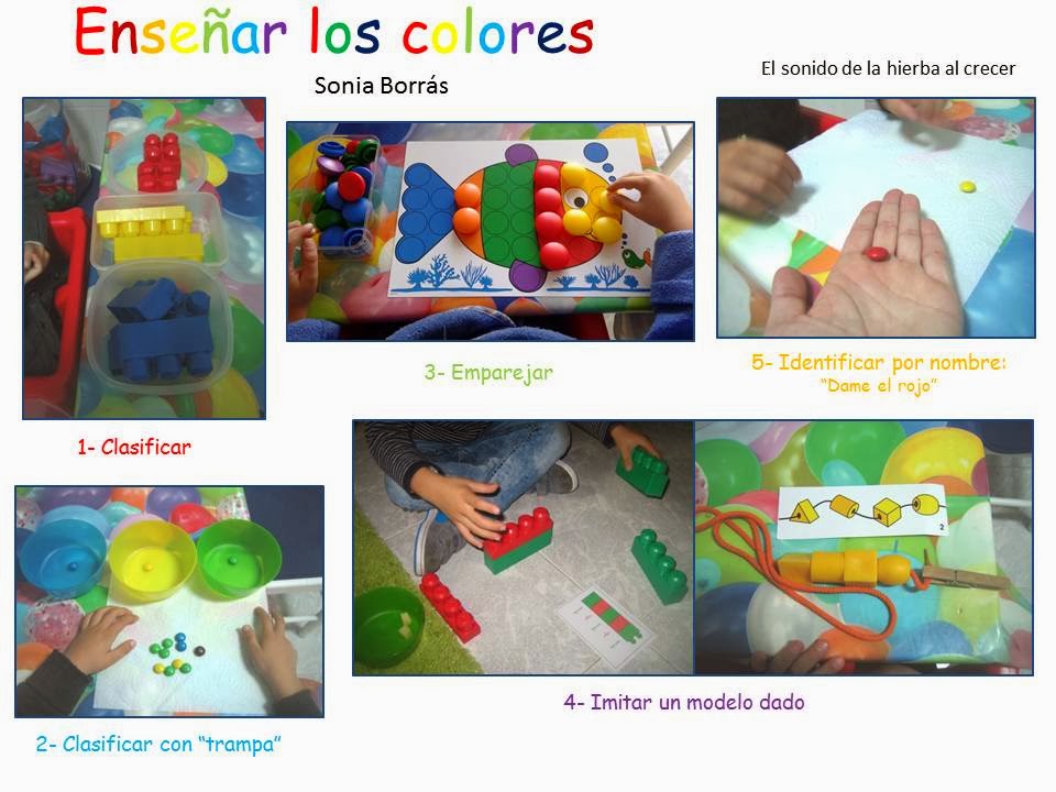 Se colocan sobre la mesa objetos de distintos colores (piezas de lego, por ejemplo). El ejercicio consistirá en que el niño ordene todos los objetos rojos juntos, los amarillos juntos, etc. Como ayuda, es bueno que tenga una referencia de donde colocarlos.