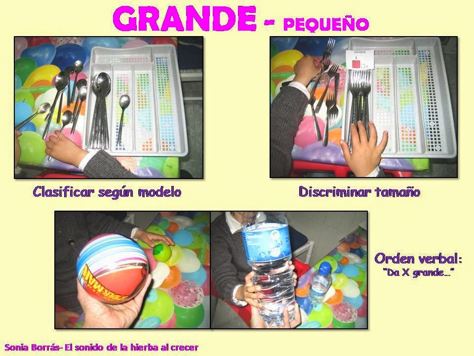 Utilizamos una serie de objetos cotidianos en dos tamaños: grande y pequeño (que se vea bien la diferencia: coche grande / coche pequeño – taza grande / taza pequeña, etc.). La orden será “ordena los grandes juntos” (u “ordena los pequeños juntos”). El niño colocará en un lado todos los objetos grandes y al otro lado todos los objetos pequeños.