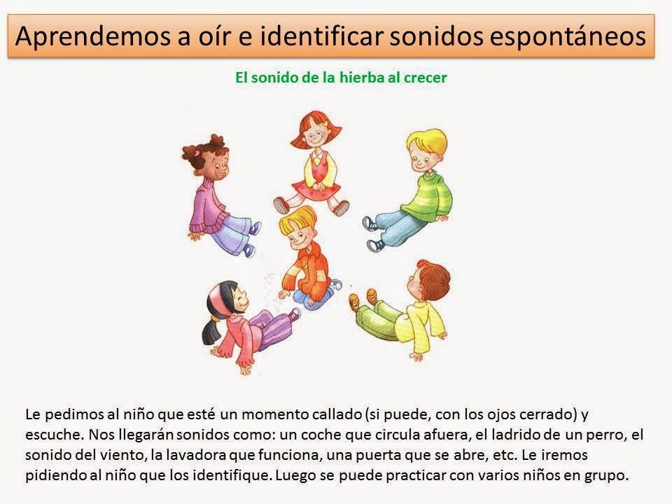 Le pedimos al niño que esté un momento callado (si puede, con los ojos cerrado) y escuche. Nos llegarán sonidos como: un coche que circula afuera, el ladrido de un perro, el sonido del viento, la lavadora que funciona, una puerta que se abreetc. Le iremos pidiendo al niño que los identifique.