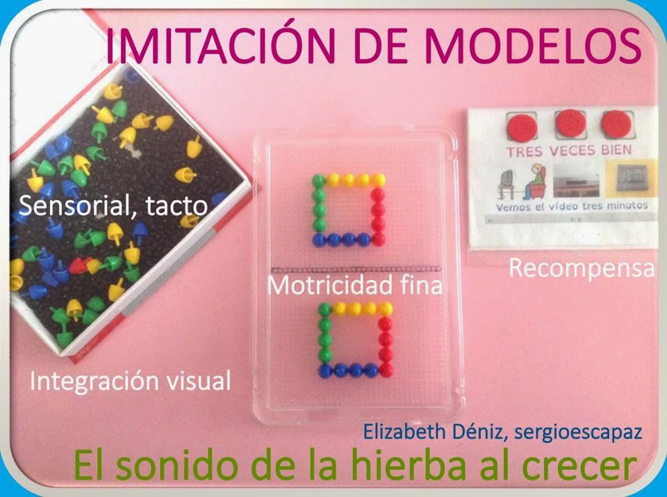 Es muy importante esto que recalcas del contacto visual. Hay niños que no tienen problemas de imitación pero si de interactuar. Gloria es capaz de realizar modelos en segundos(hace puzzles con una rapidez impresionante, y de 50 o 60 piezas.) Pero los hace sóla sin pedir ayuda, y sin mirarte. Lo importante de este ejercicio para mí es el que el niño se tenga que apoyar en todo lo que tú hagas, y pedir las piezas cada vez, manteniendo la mirada lo más posible. Yo también hago esto usando los juegos de pinchitos de colores.
