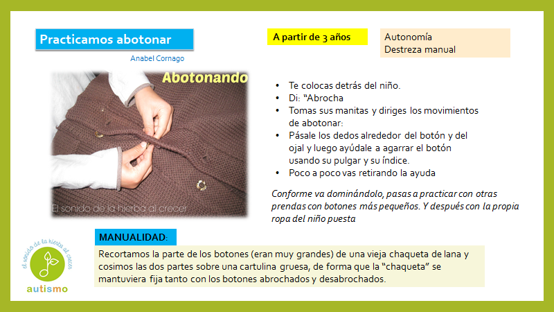 Nudos muy sencillos al principio y con cordeles muy gruesos. Poco a poco se puede ir pasando a practicar con los zapatos (en esto estamos ahora).