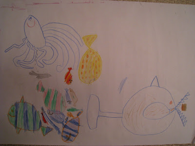 Hoy en día solemos terminar esta sesión con un dibujo: Erik dibuja dónde ha estado, como “Erik en el submarino” o esta versión del Acuario «con pulpo y tiburón»: