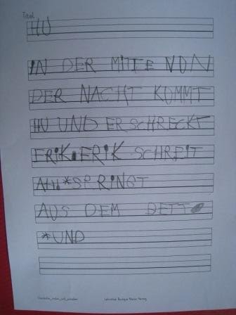 Y ahora vamos a dar un paso más con ejercicios para estimular la creación de historias, poquito a poco, como siempre. En el caso de Erk, hemos combinado lenguaje oral, dibujo y escritura de frases muy sencillas. Y lo hemos trabajado también tanto a solas con él como en los grupos de juego.