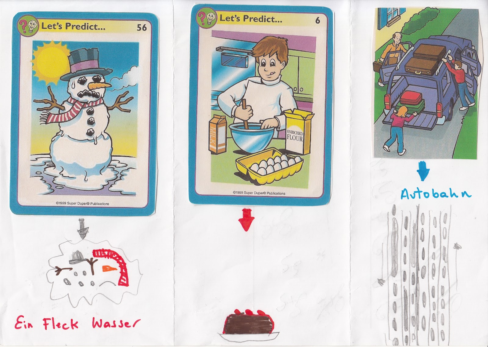 Normalmente trabajamos tres tarjetas por día. Pego las tres tarjetas en una hoja de papel, que doblo para luego presentar cada situación de forma individual. Bajo cada tarjeta, dibujamos una flecha y después Erik tiene que dibujar debajo lo que él cree que ocurre a continuación.