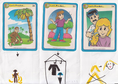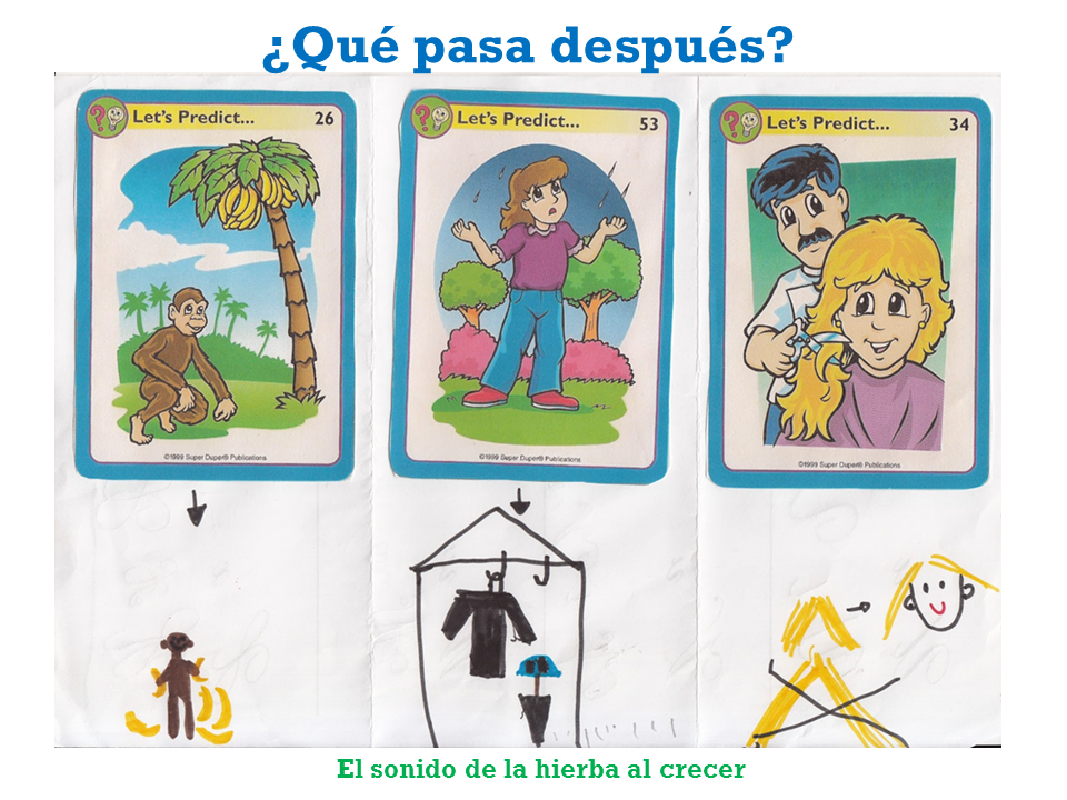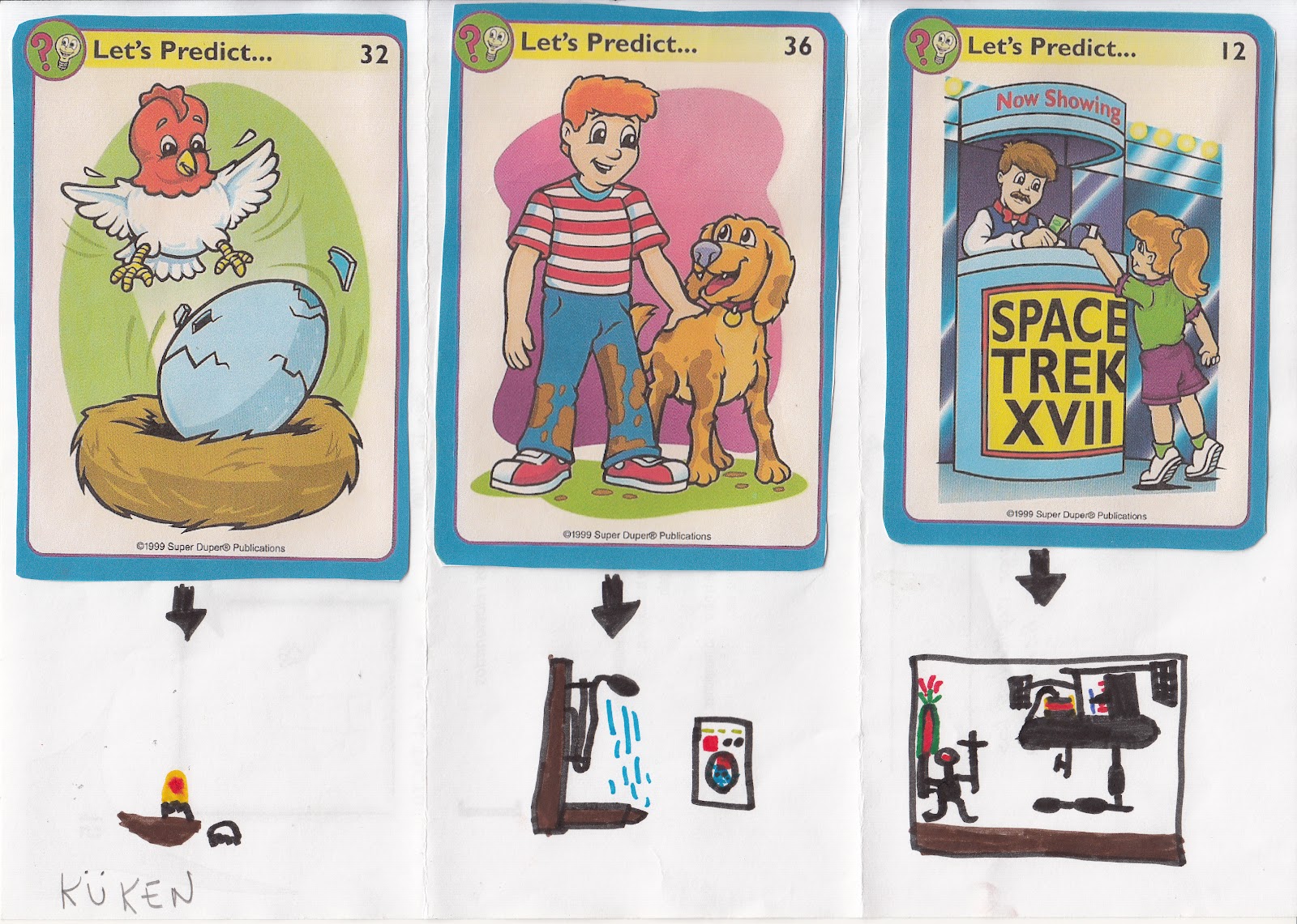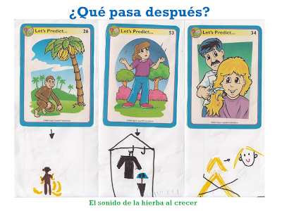 Ahora hemos dado un paso más. Estos días estoy trabajando con Erik unas tarjetas en las que se presenta una situación y él tiene que predecir qué pasa después. La verdad es que es un material muy bueno. Estoy muy contenta con los resultados, pues Erik no necesita de mi ayuda para decidir qué pasa después.