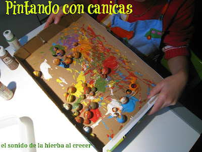 Propongo hoy una idea con la que hemos pasado un rato estupendo: pintar con canicas. Además de la obra de arte que ha salido, jiji, nos hemos divertido, nos hemos manchado y hemos trabajado aspectos sensoriales y motrices.
