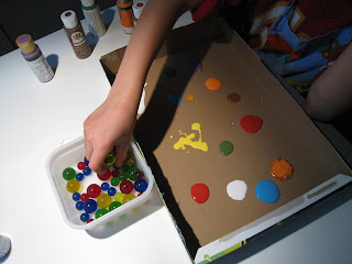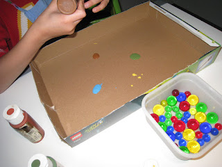 ¿Veis todas esas canicas pringosas? Pues luego las hemos cogido con las manos, las hemos embadurnado y hemos puesto huellas en otra hoja. No tengo fotos porque imposible coger la cámara, jjj