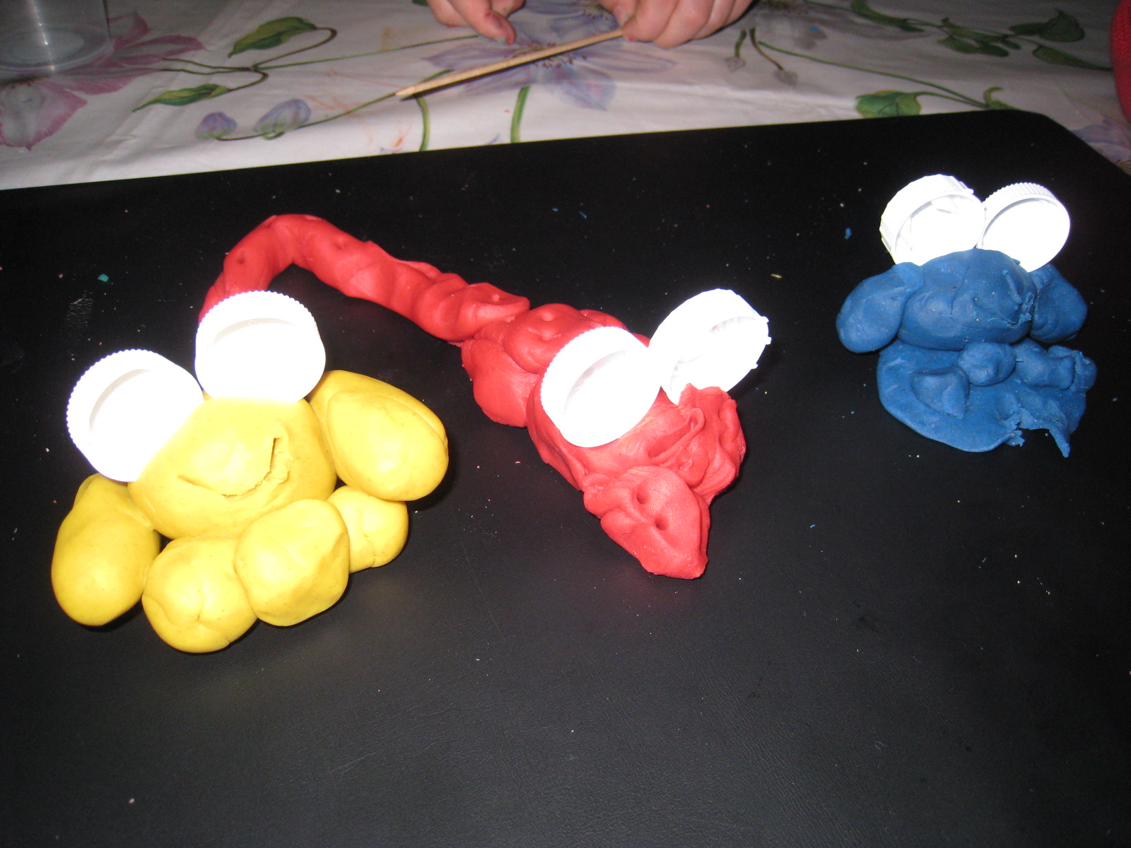 Y por último tres de nuestras creaciones (los ojos son tapones de cajas de leche):