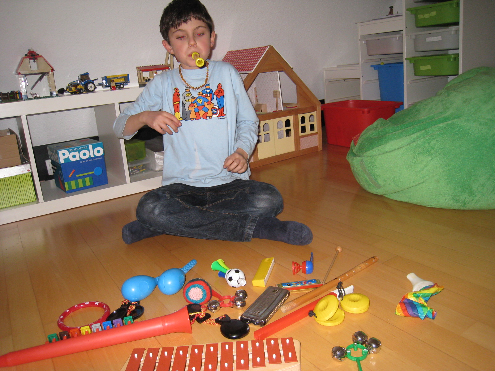 – El niño coge la maraca, la hace sonar, y coge la flauta y la hace sonar.