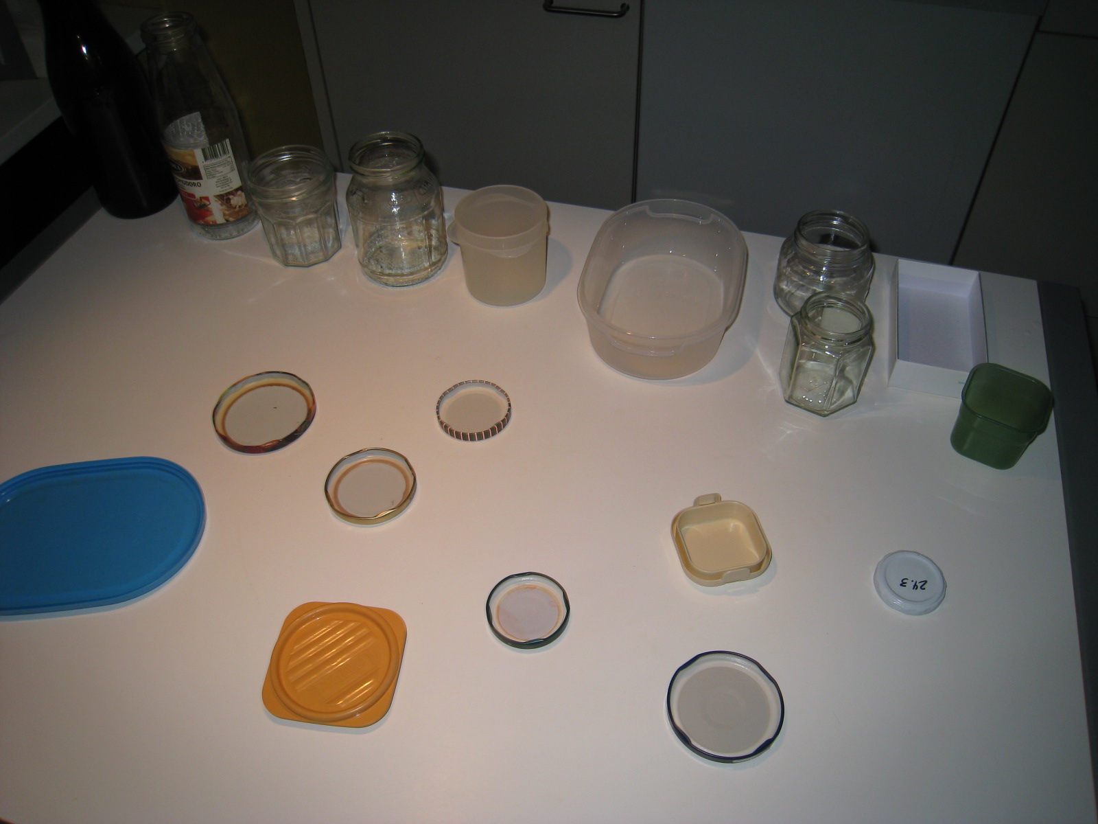 Colocas sobre una mesa diferentes botes, tupper y cajas, todos abiertos: