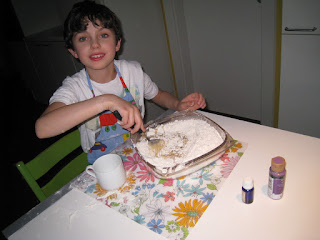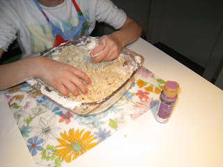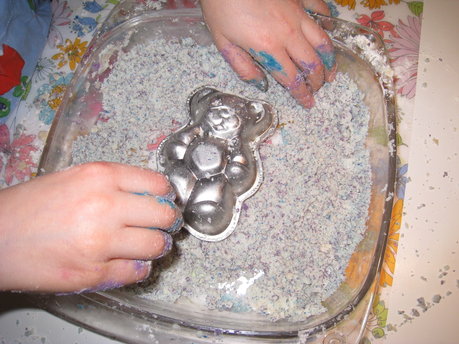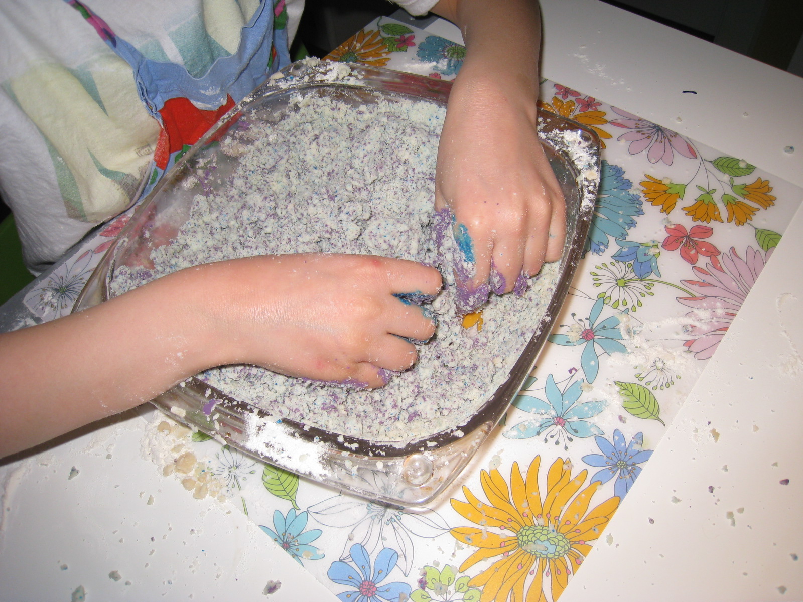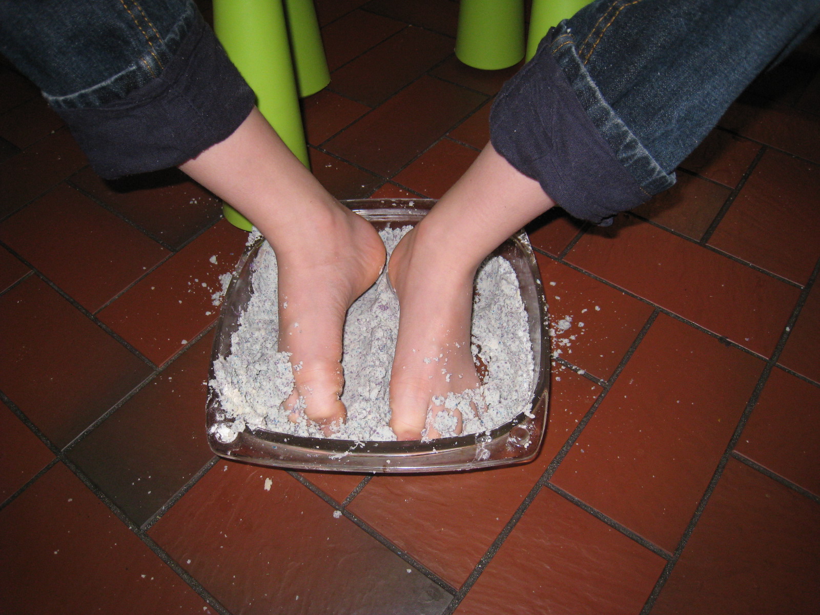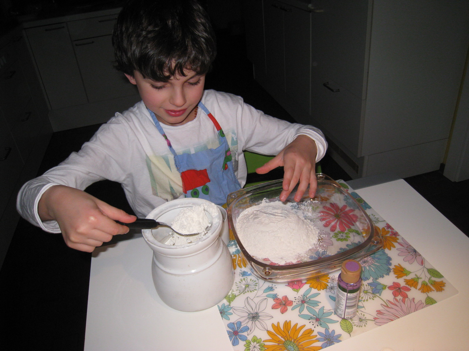 Hoy nos hemos embadurnado de nuevo; bueno, a nosotros y a la cocina. La actividad de hoy combina con las manos en la masa (tactil), coordinación visomotriz, estimulación del olfato y efecto calmante. Sí, nos hemos hecho una caja sensorial que llamamos «dulces sueños».