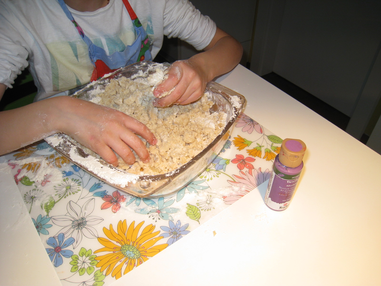 Ponemos el color con el colorante alimenticio (azul) y pintura acrílica lila). Un poco. Y a seguir amasando.