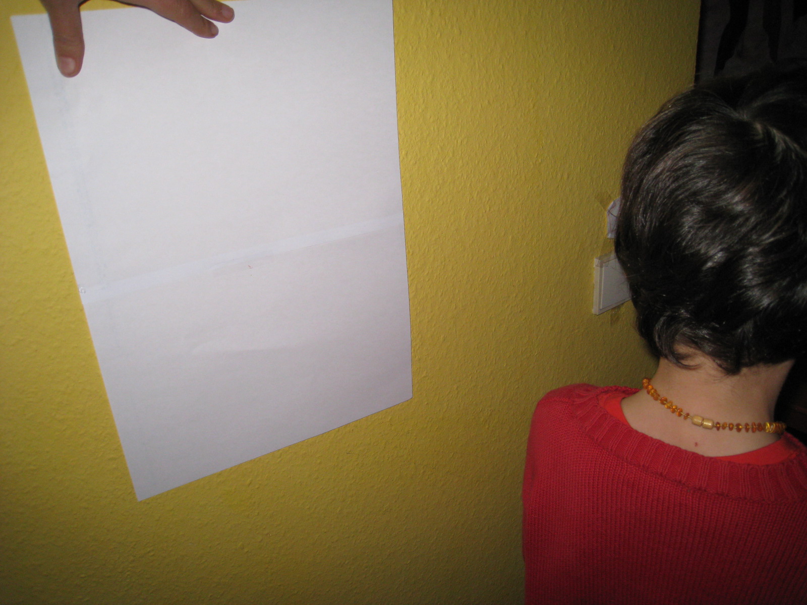 Colocas una hoja de papel DinA3 en la pared, donde se proyecte la sombra del perfil de la cabeza. Y la marcas con un lápiz. Luego haces lo mismo con la tuya y que el niño la dibuje.