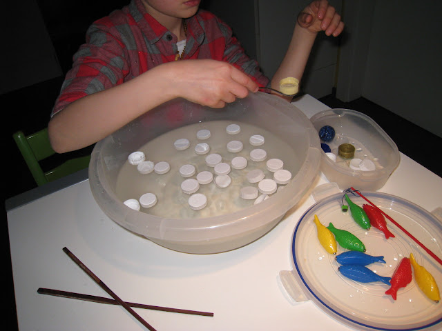 Y el más difícil todavía con los palillos chinos. A Erik le encanta la comida asiática, pero todavía no domina bien comer con los palillos. Así que practicamos «pescando» las tapitas. Primero lo hizo él; después jugamos los dos a ver quién conseguia más…. ¡y me ganó!