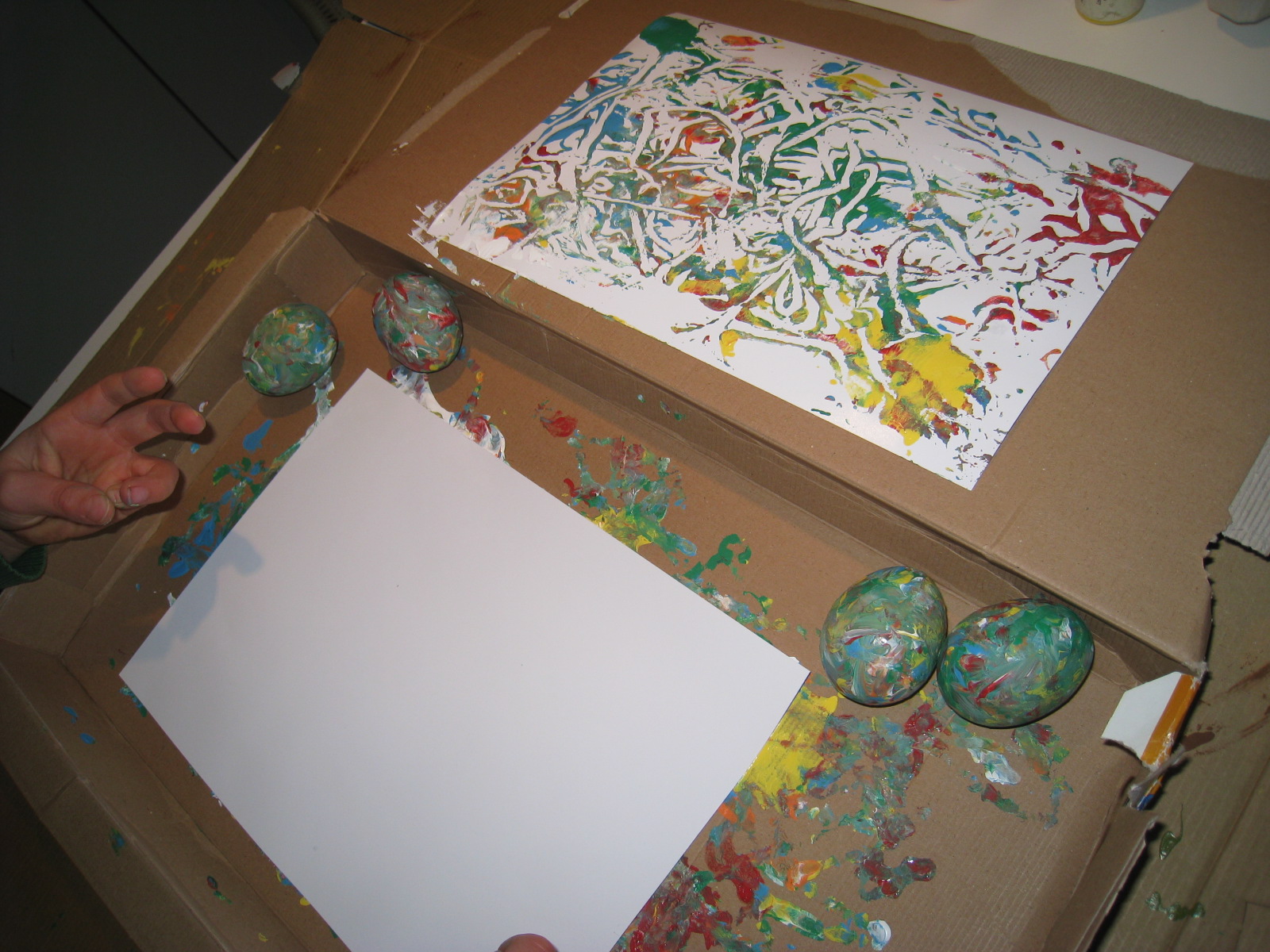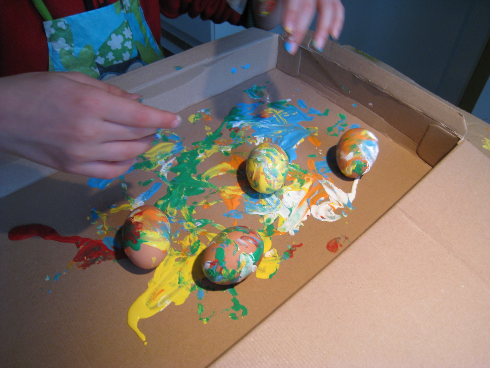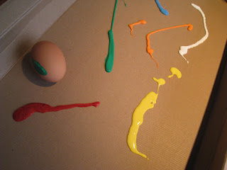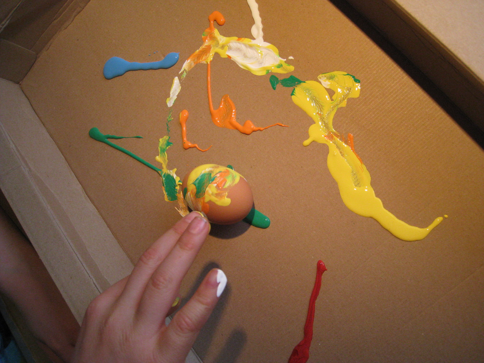 Después, sobre una caja de cartón -nosotros aprovechamos las de los Lego-, hemos echado diferentes colores de pintura acrílica. Y el primer huevo lo ha empezado Erik a mover con sus manitas: