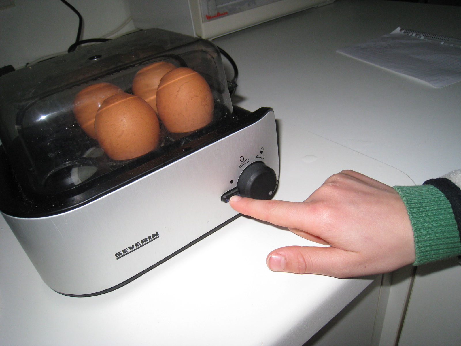 Primero hemos cocido los huevos, y de paso Erik ha aprendido a poner en marcha el cuecehuevos, con varios ensayos hasta que lo ha interiorizado bien.