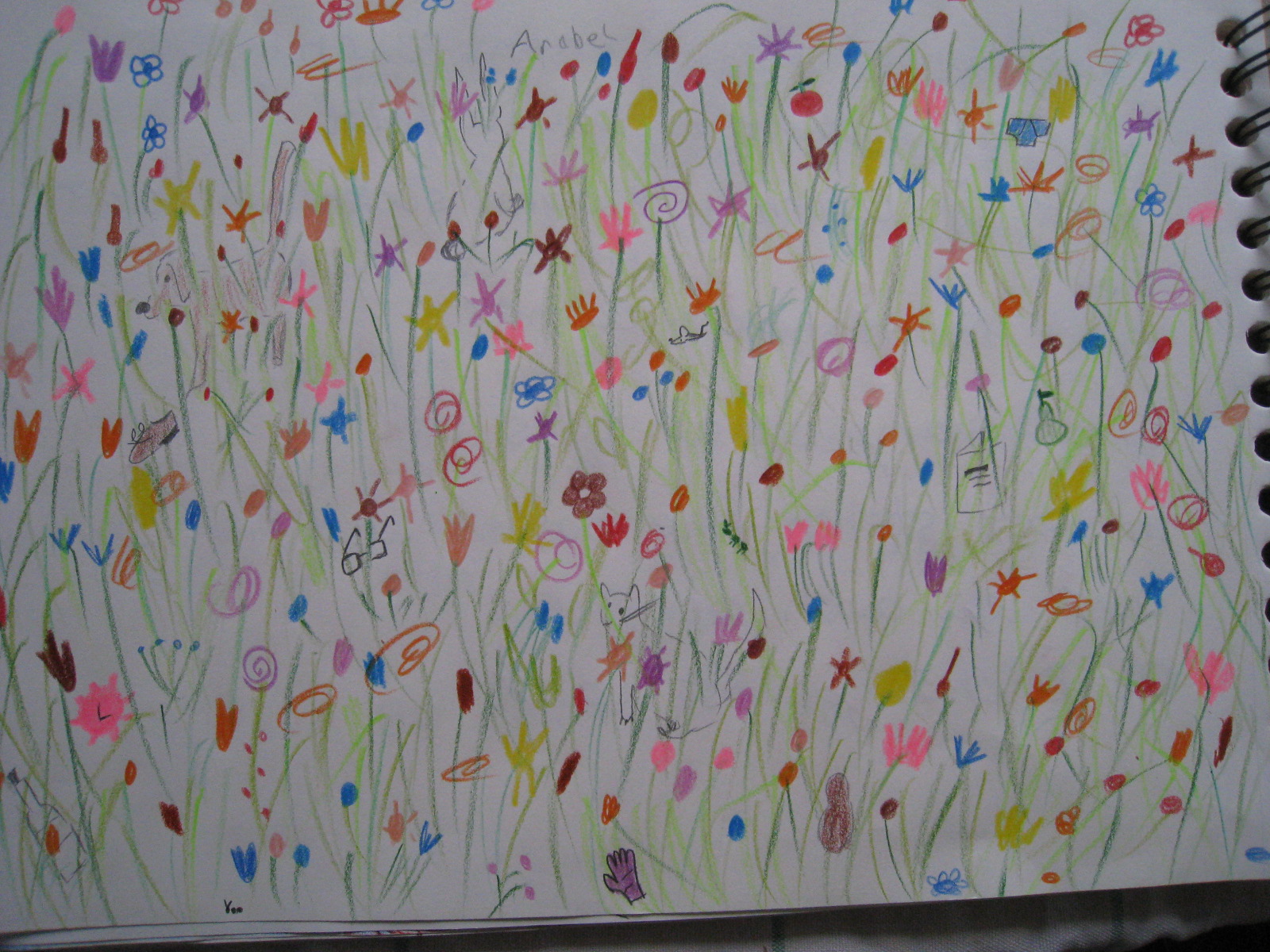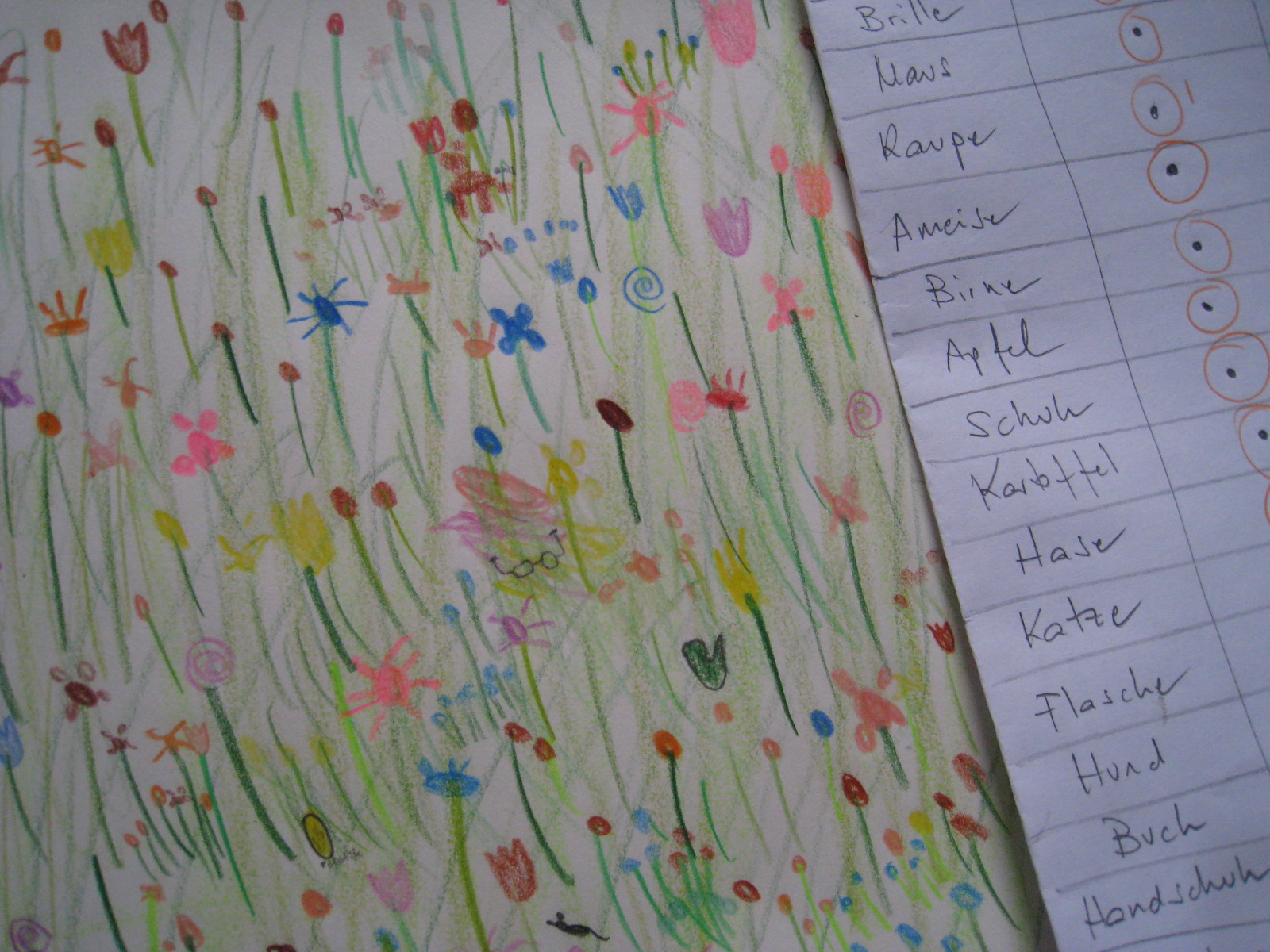 Después, hago una lista de objetos que tenemos que esconder cada uno en la pradera: gafas, gato, conejo, libro, cazoncillos, guantes, perro, oruga, hormiga, guantes, hormiga, botella, ratón, pera, manzana…
