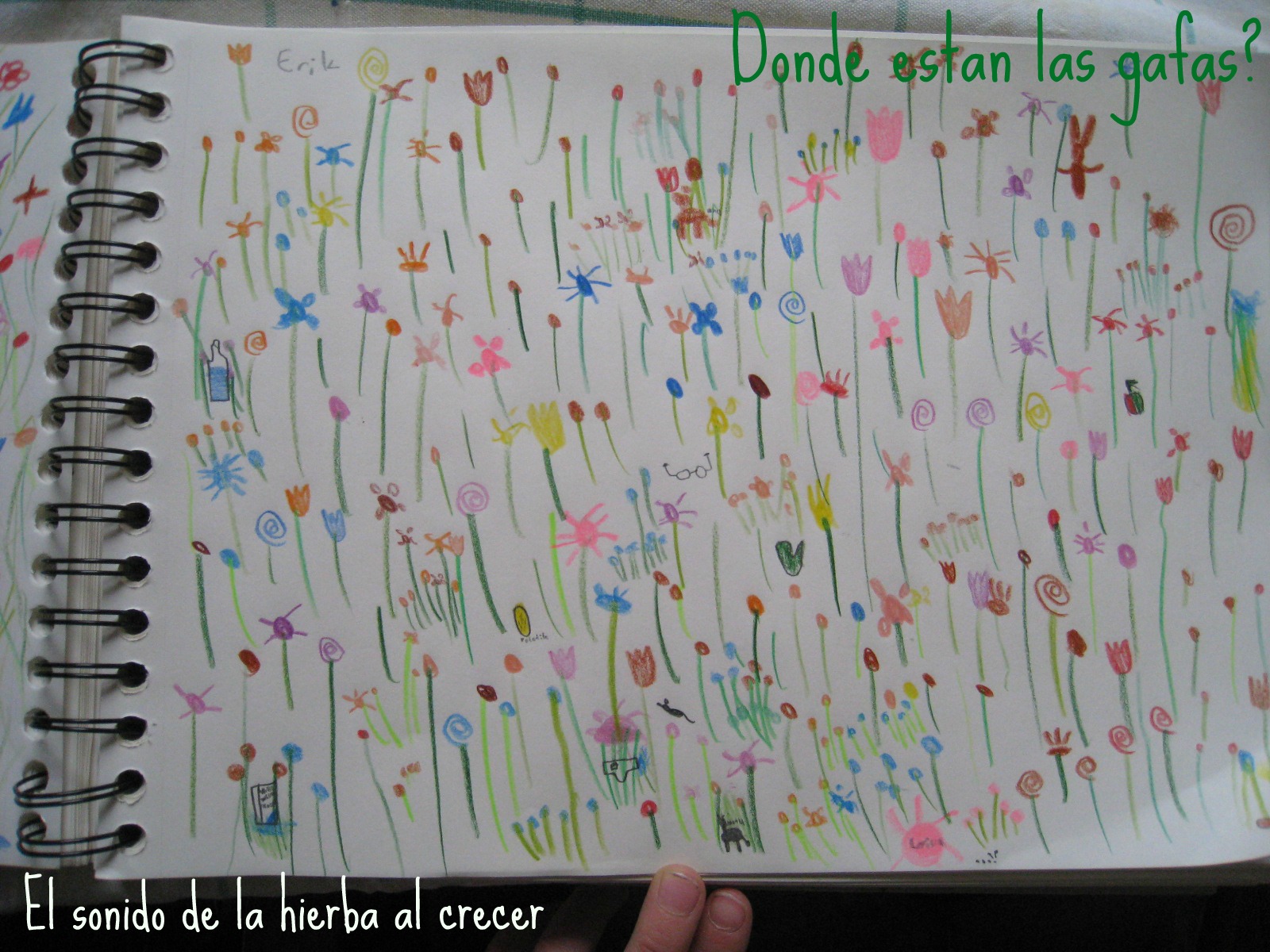 Erik y yo dibujamos en dos hojas del cuaderno praderas con flores.