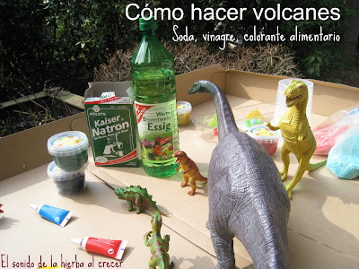 La tarde de ayer fue una pasada. Nos preparamos una «caja sensorial» que simulaba el hábitat de los dinosaurios, jugamos con ellos, y luego disfrutamos con «volcanes en erupción». Es facilísimo de hacer y muy, muy divertido.