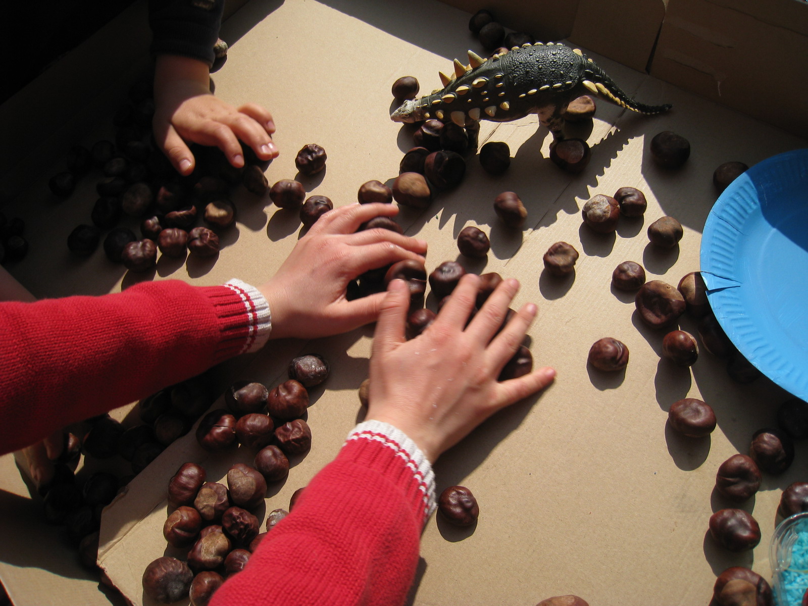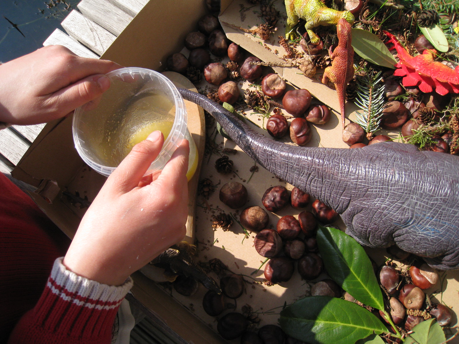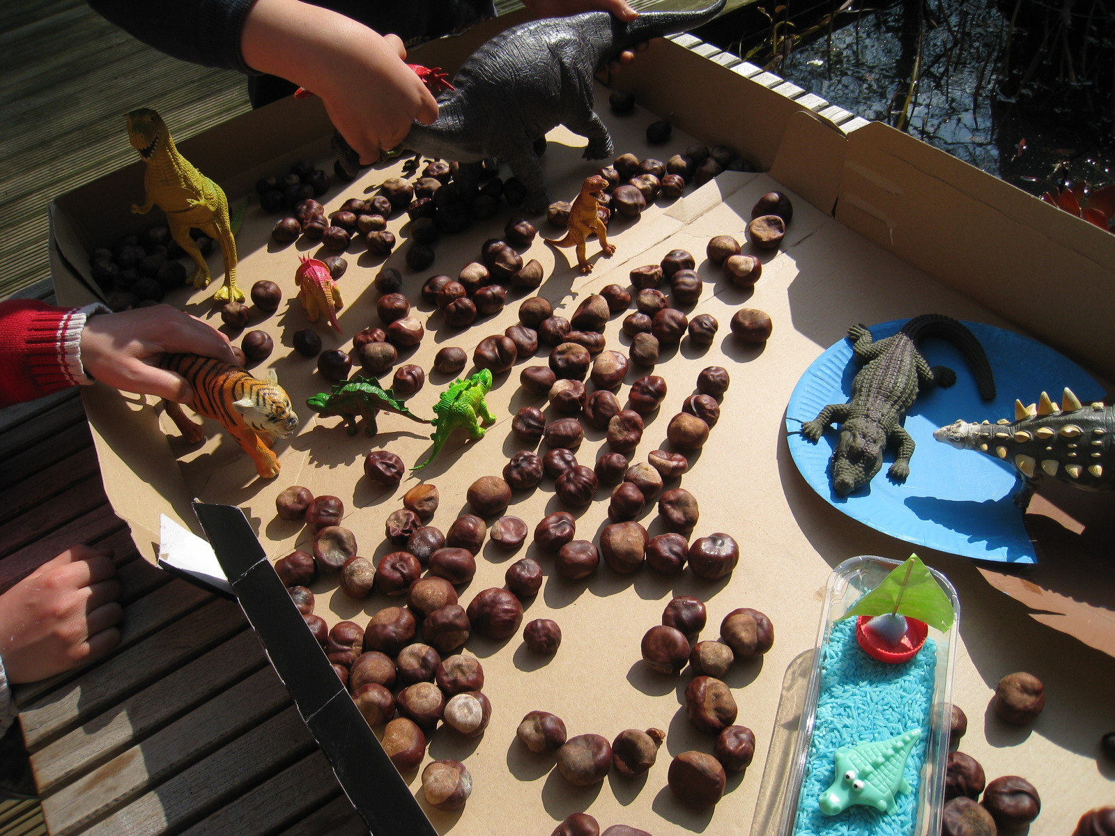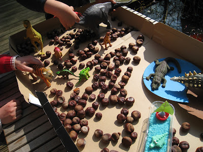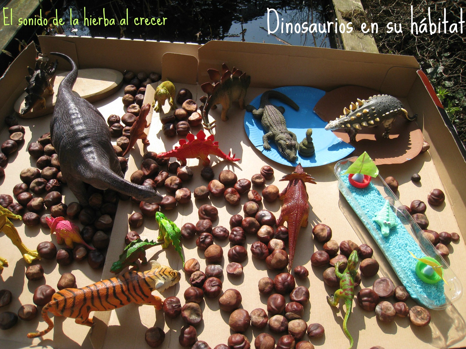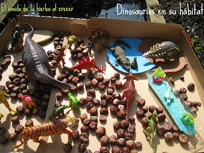 Necesitas castañas, arroz pintado, hierbas, hojas, piñas de pino, etc. para la caja sensorial. Y todo lo que te imagines. Además de dinosaurios, claro.