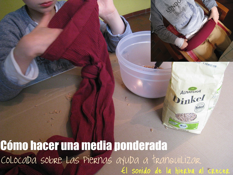 La acabo de hacer y Rafael ya la tiene puesta en las piernas, sentado, tranquilo, contento. La toca y la mira intrigado, y se la puso en el cuello tipo bufanda…(el peso en los hombros le hace bien, lo tranquiliza mucho….) Genial Anabel!!!! gracias como siempre!!!
