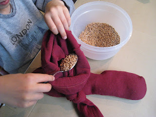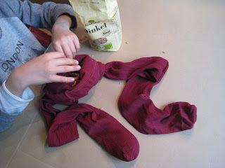 Rellenando con sus manitas. Veréis que he hecho un nudo delante de una de las piernas del leotardo para que el relleno entre solo por un lado.