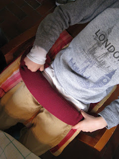1. La acabo de hacer y Rafael ya la tiene puesta en las piernas, sentado, tranquilo, contento. La toca y la mira intrigado, y se la puso en el cuello tipo bufanda…(el peso en los hombros le hace bien, lo tranquiliza mucho….) Genial Anabel!!!! gracias como siempre!!!