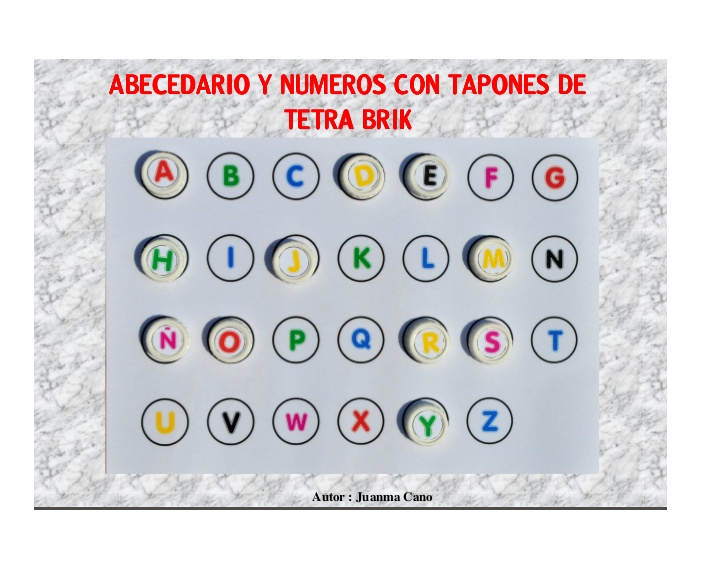 Comparto hoy un material muy bueno para trabajar el reconocimiento de las letras y de los números que ha preparado Juanma Cano con tapones de tetrabrik. Toca guardar los tapones, sobre ello pegar las letras o los números, imprimir las plantillas… ¡y a colocar! Jugando y aprendiendo también en verano.