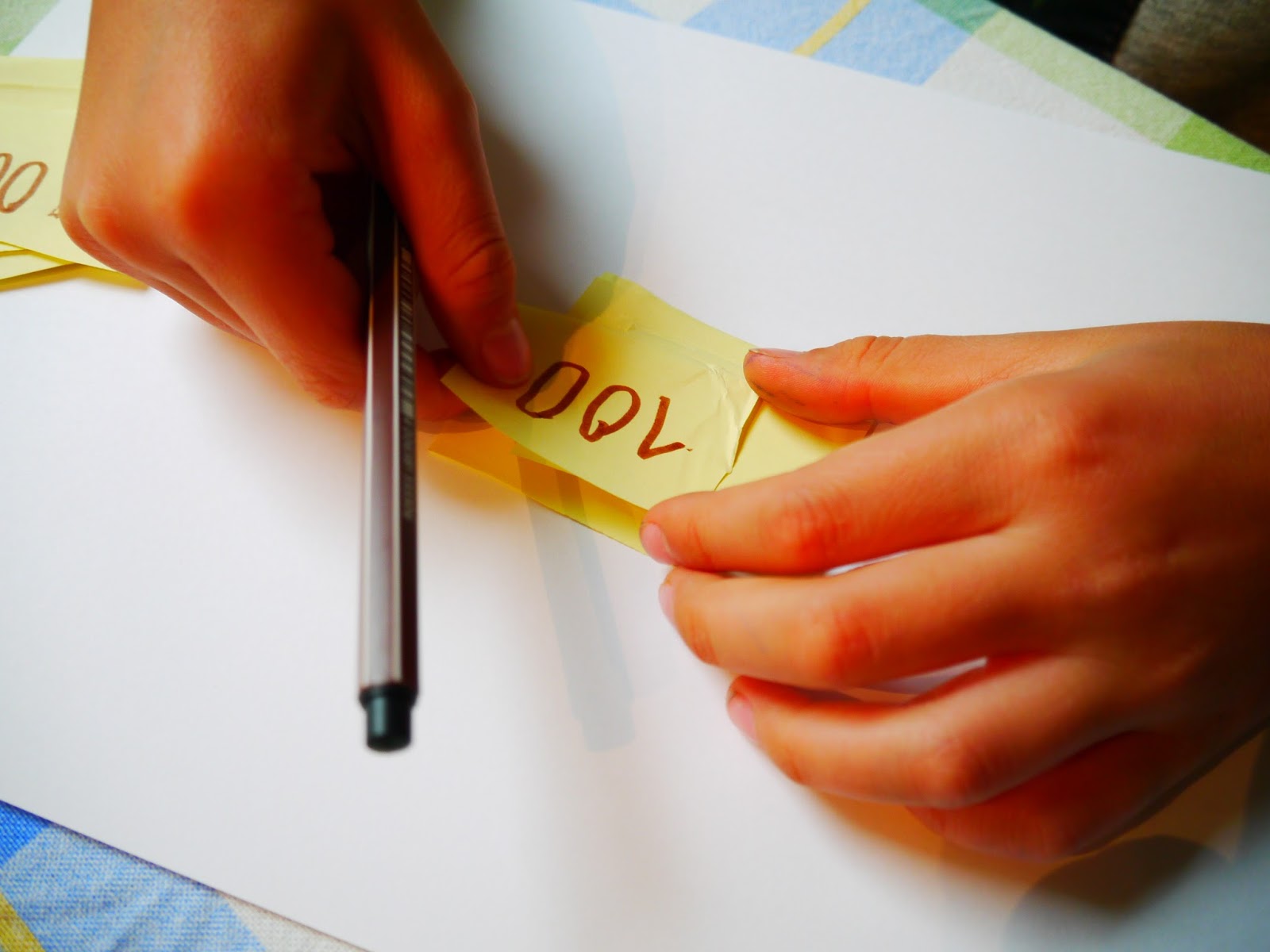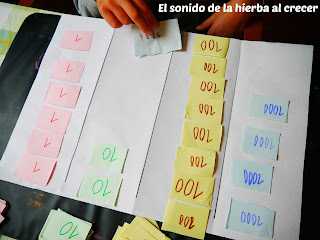 Preparas un tablero grande, dividido en cuatro partes de forma vertical (unidades, decenas, centenas y unidades de mil). POnes arriba una tarjetita de referencia.