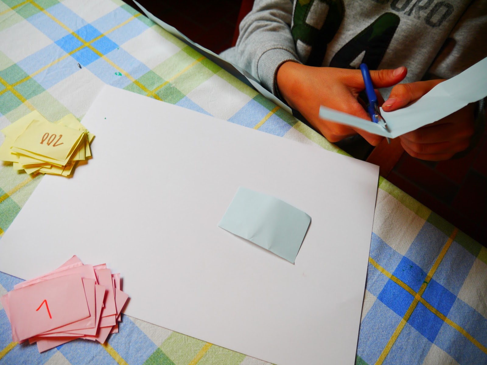 Las doblas, rerodablas y requetedoblas para que luego, al abrir, sea más sencillo recortarlas en tarjetas pequeñas.