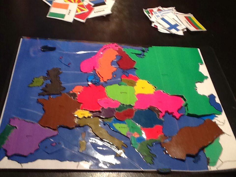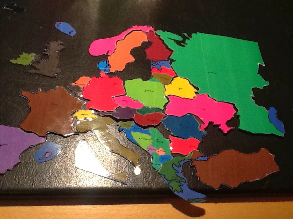 Empezamos con Europa. Tenemos el mapa de Europa con los países de colores y el nombre de la capital. Muy bien, lo imprimimos dos veces. Laminamos. Recortamos los países de uno de los mapas. Ojo, no os olvidéis Chipre, jajajaj. Un truco: algunos países son muy pequeñitos, así que nosotros recortamos el Benelux o la Antigua Yugoslavia o los Países Bálticos juntitos.