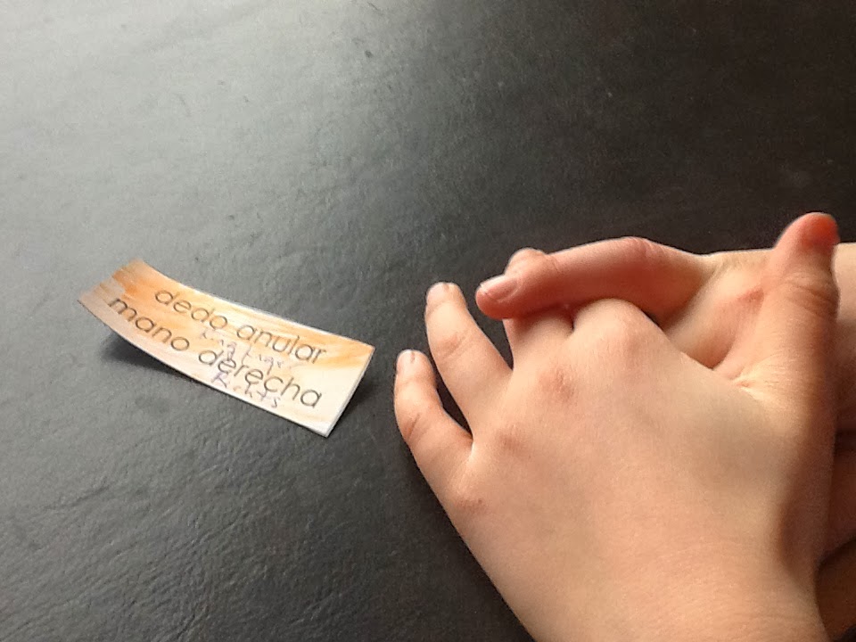 Primero dedicimos de qué Color pintar las etiquetas: Color Carne para el nombre de los dedos, naranja lado derecho y verde lado izquierdo, según indicaciones de Erik. Pues lo pintó: