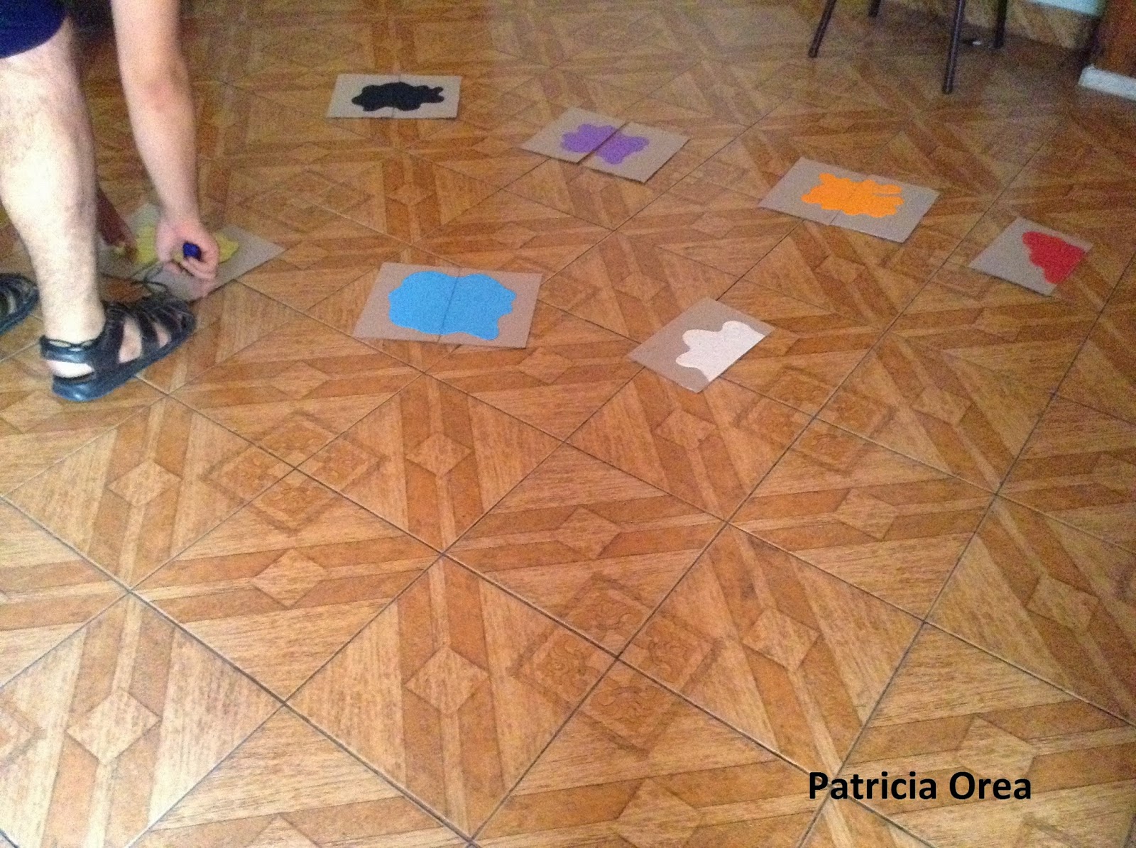 Primero hay que realizar unos rompecabezas de dos piezas en cartón: una mancha simétrica de pintura o un pegado de goma eva, por ejemplo.