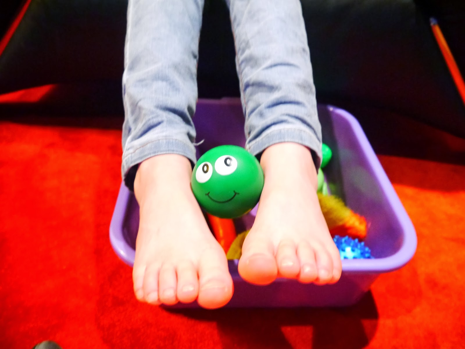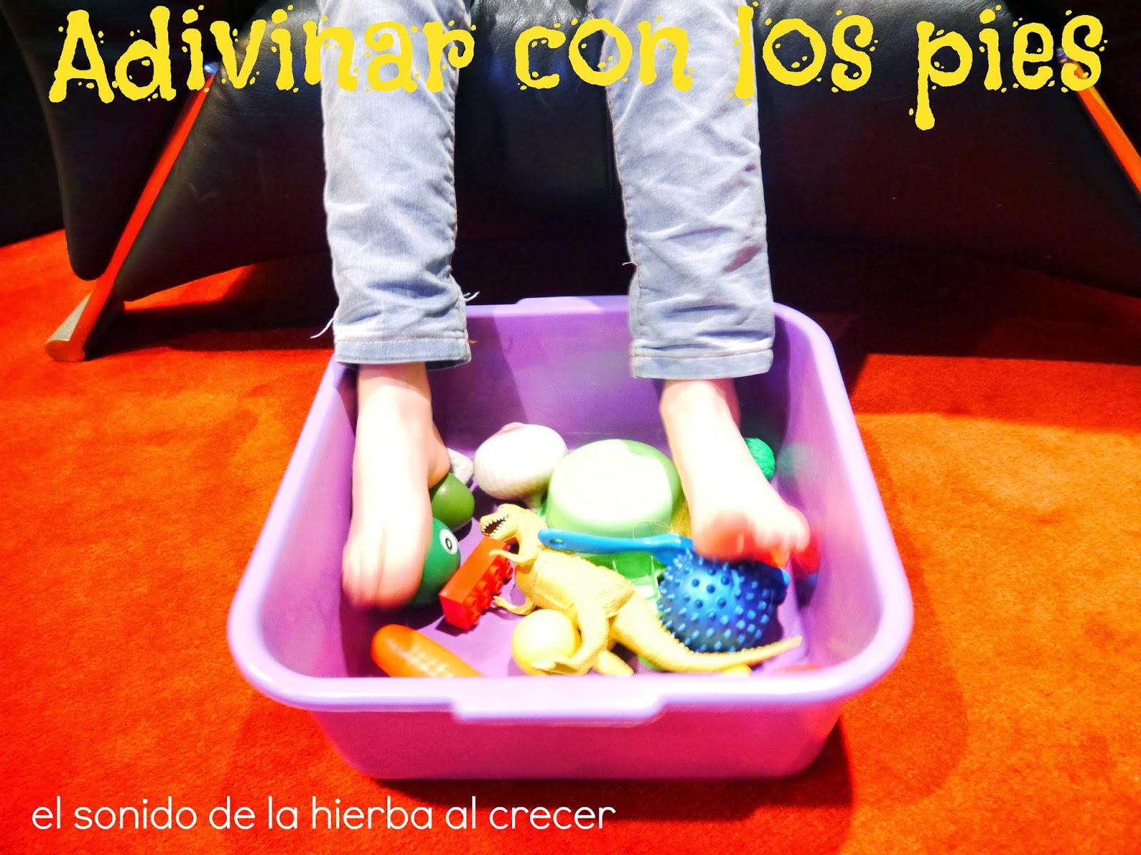Preparas en una caja objetos con diferentes materiales, formas y texturas. El niño debe «pescar» uno con los pies mientras tiene los ojos cerrados (se le puede colocar un pañuelo a modo de Venda, pero Erik prefiere ojos cerrados). Eleva el objeto (actividad motriz) y tiene que adivinar qué objeto ha cogido.