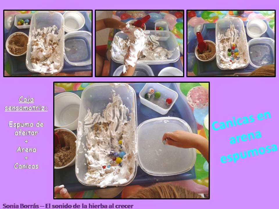 A Adriá, el campeón de Sonia Borrás, le encanta esta caja sensorial: mezcla de Arena con espuma de afeitar (qué pringue) y canicas redondas lisas (qué gusto). A tocar, frotar, sacar, meter, lavar…. ¡ufff!!! menudo disfrute.