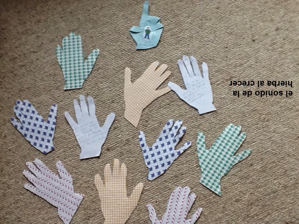 manitas de Erik impresas sobre papel de diferentes colores. Luego las hemos