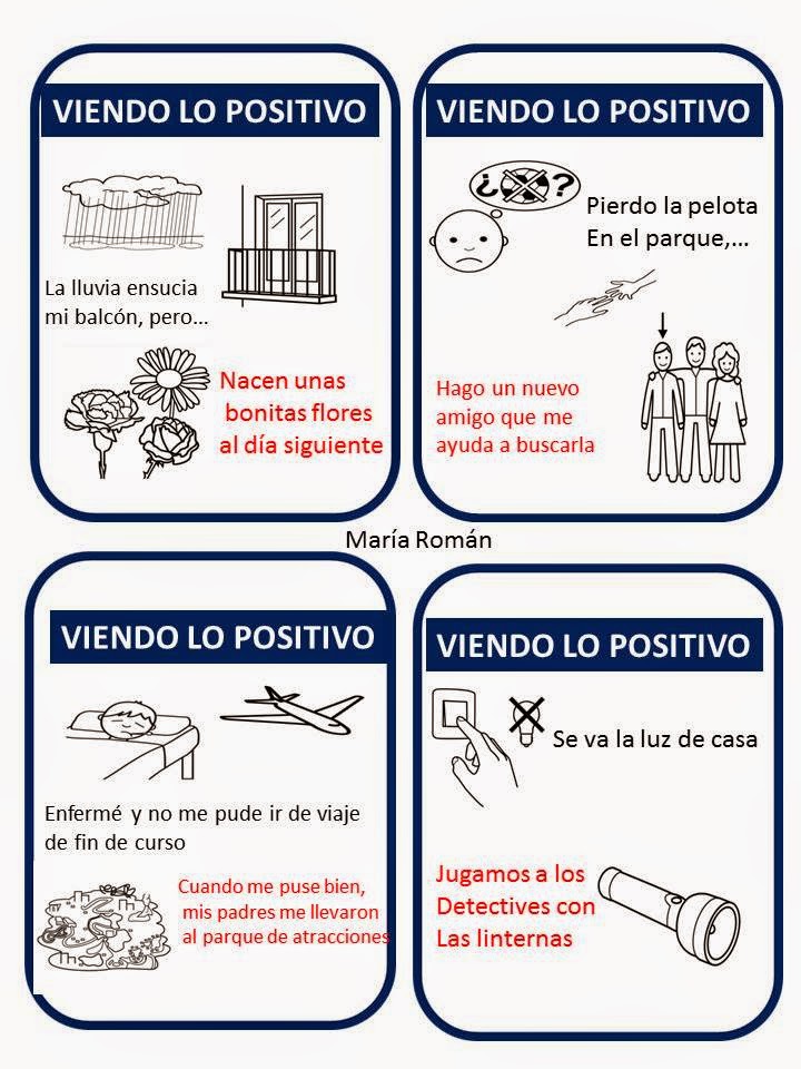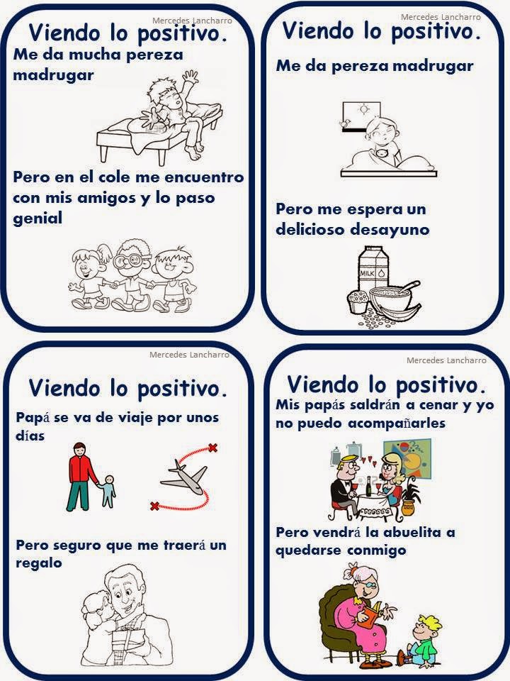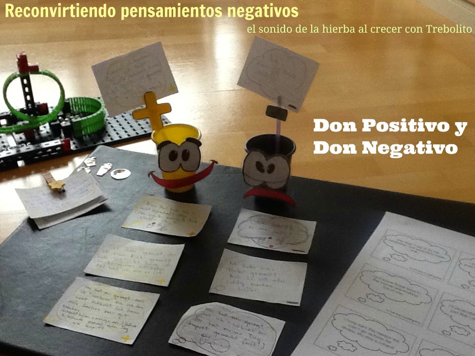 Los pensamientos negativos pueden abrumar el razonamiento y siempre provocan ansiedad. Llevamos tiempo trabajando la ansiedad (ver AQUÍ) con muy buenos resultados, y hoy os propongo una actividad nueva que también está funcionando genial: reconvertir pensamientos negativos en positivos gracias a Don Positivo y Don Negativo.