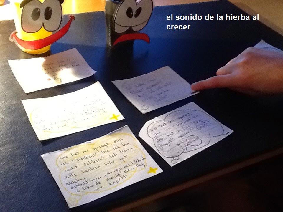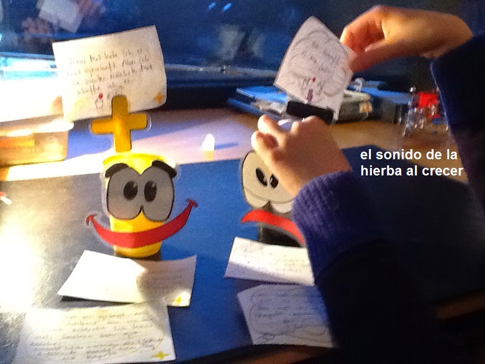 Para ello, hemos creado dos plantillas caseras: una con el bocadillo de pensar en color amarillo y el símbolo +; otra con el bocadillo negro y el simbolo -. Erik y yo hemos escrito ese pensamiento en las dos versiones. Cada día hemos ido haciendo alguno nuevo. Después, Erik los ha ido emperejando, colocando sobre los personajes y… ¡leyendo con la entonación adecuada! Jajaja, todos los negativos terminan con un gruñido (wöhr). Tras ello, representamos la situación con uno de nuestros role play o teratrillo casero representado por nosotros.