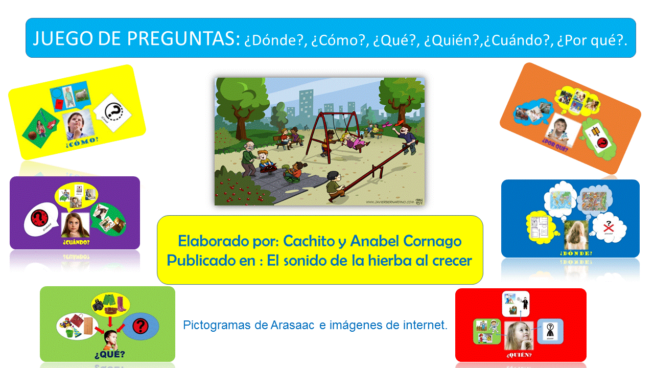 Hace ya muchos años que trabajamos con Erik las preguntas qué, quién, dónde, cómo….. tanto que él respondiera como que las formulara. Incluso en la fase final ideamos un juego con un dado de seis caras y tarjetas que respondieran a esas preguntas… Material que cedí a otras familias. Pero tenemos una hierbita que se llama Carmen Fernández Cacho, Cachito para todos… Y nos ha preparado el juego en precioso, con montones de tarjetas. Uf, gracias de corazón, os va a venir genial a muchos. Todo como siempre de libre descarga.