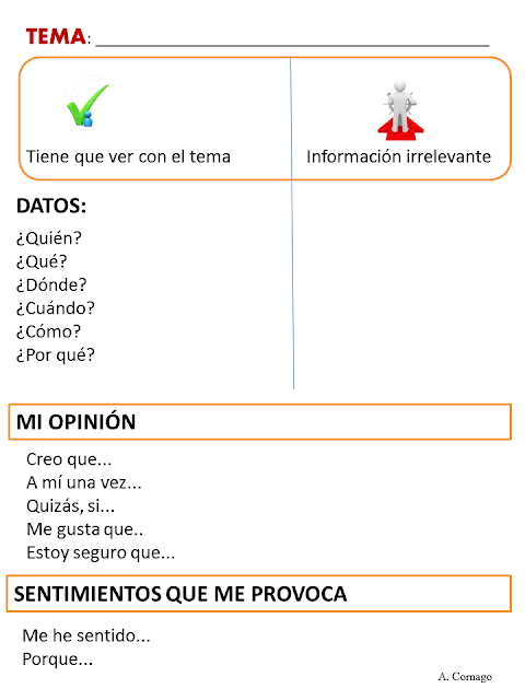 Hace poco preparé una plantilla que a Erik le está viniendo muy bien: nos sirve para detectar datos relevantes… pero también para que siga avanzando al poder expresar su opinión o qué sentimientos le ha producido un texto determinado. También cómo guía de conversación cuando participa en un tema con sus compis de clase.