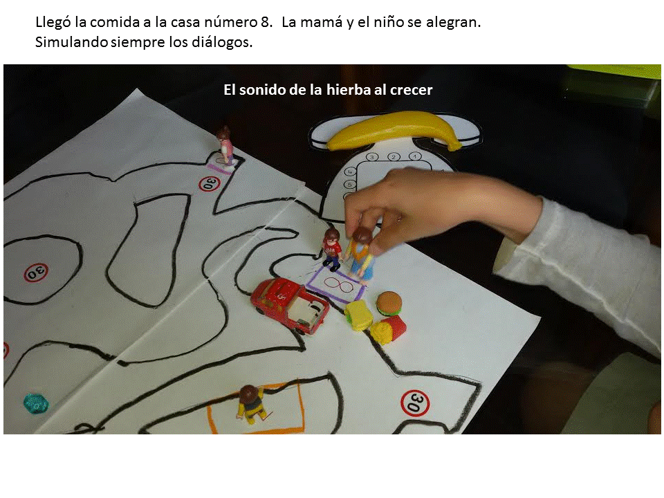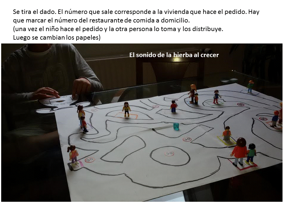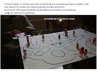Se tira dado. Sale el número 5 (por ejemplo). La familia que vive en la casa 5 hace el pedido. Se llama, se simulan los diálogos, se conduce, se entrega (y se hacen los diálogos también).
