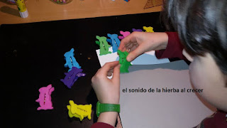 Quizás os guste también esta idea. Aprovechando unas pinzas con forma de conejitos, podemos practicar la imitación (que el niño haga una serie igual) o algo muchísimo más divertido: