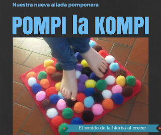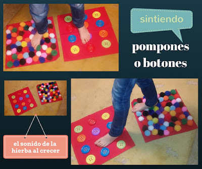 Cosiendo diferentes materiales sobre servilletas que teníamos sin estrenar estamos preparando un circuito con texturas para los pies. Tenemos ya dos nuevas aliadas: Pompi la Kompi y a Botonera…