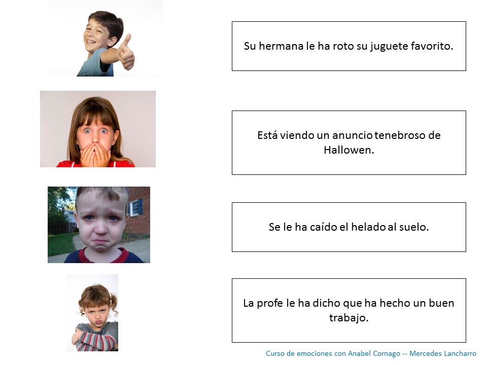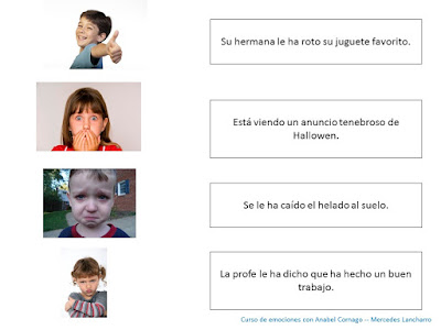 Uno de los ejercicios que le vino genial a Erik cuando comenzamos la intervención en emociones fue colocar fotografías con expresiones sobre la mesa y darle instrucciones de este tipo: dame quien esta viendo una peli de miedo, señala quien tiene a la abuelita enferma, coge a quien ha perdido tres veces a la oca, etc. Lo tenéis en el Librito de las Emociones.