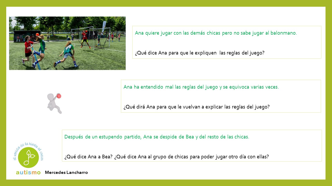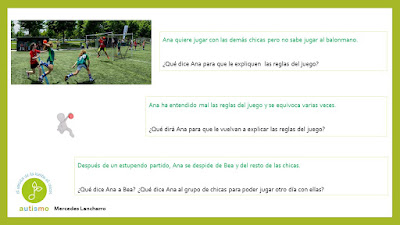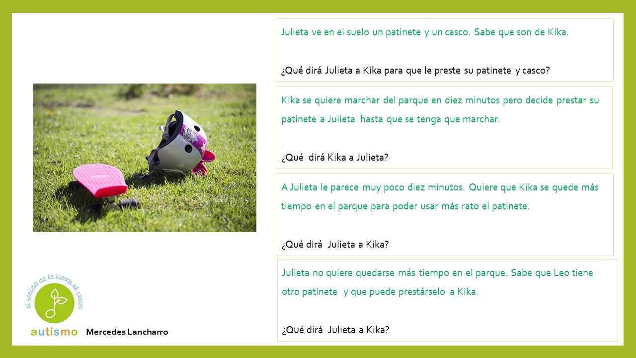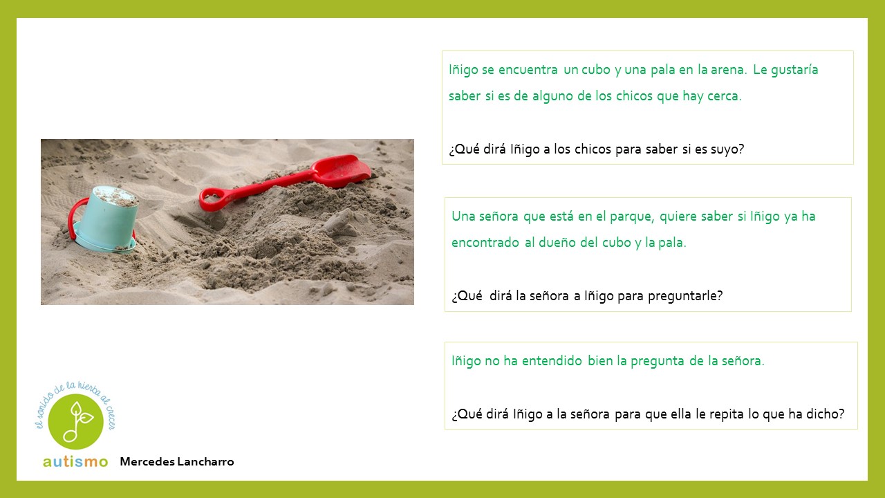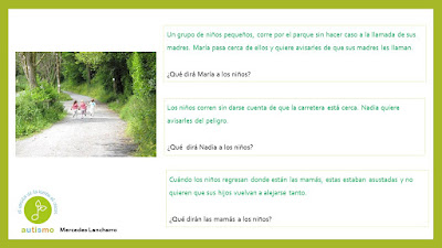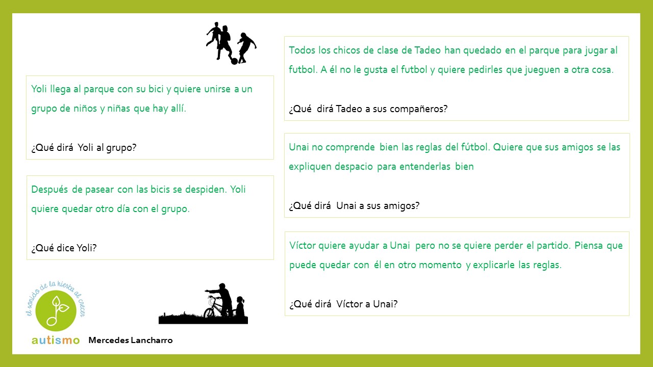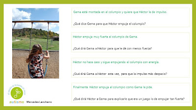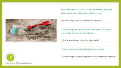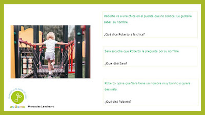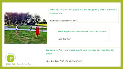 Con el propósito de seguir trabajando la pragmáticas mejorando a su vez la capacidad de diálogo y conversación para avanzar en habilidades sociales, hemos formado un grupo de trabajo para ir preparando material. Compartimos hoy diferentes situaciones que se podrían producir en un parque. Gracias a Mercedes Lancharro en esta ocasión.
