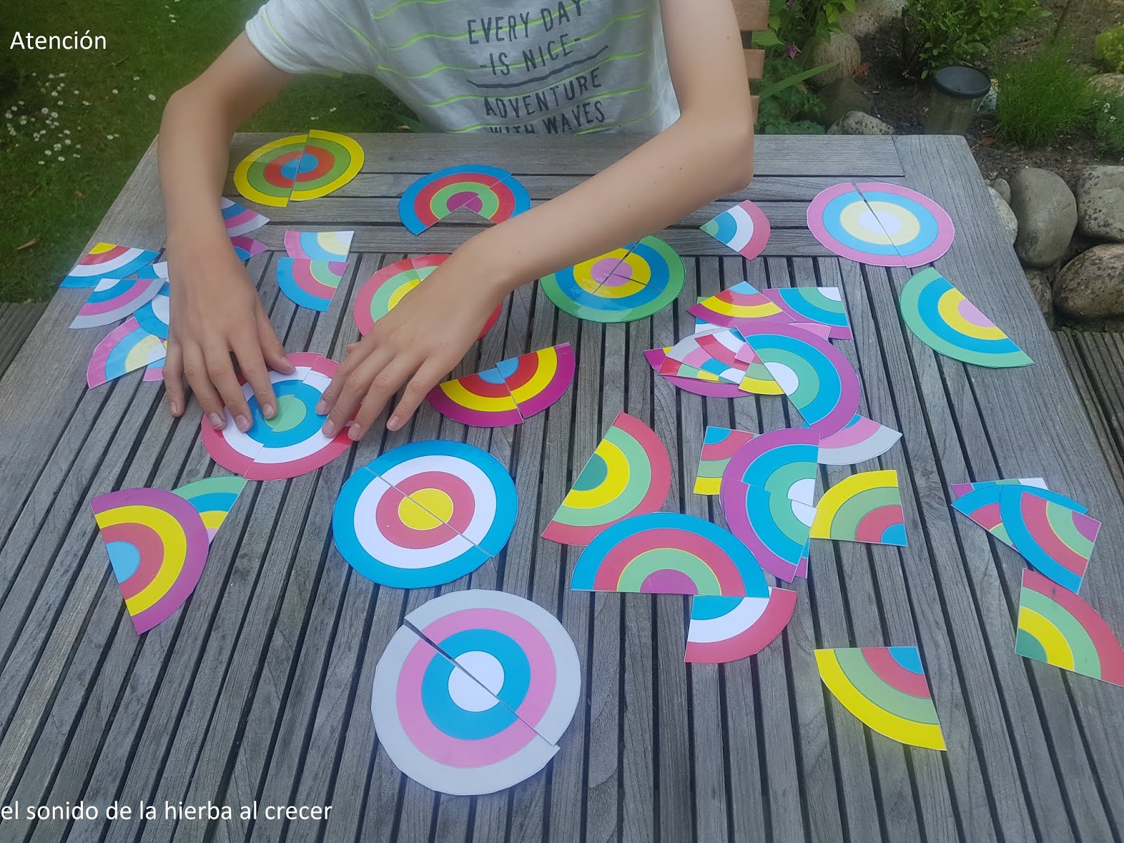 Comparto hoy un material fantástico para trabajar la atención: círculos coloridos, cortados en partes, que el peque debe volver a componer. A mi hijo le ha encantado.