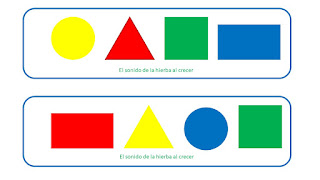 Os compartimos hoy series con formas variadas descargables, que ofrecen muchas posibilidades. Desde identificar una forma con su color, a identificar las series completas o imitar las series. Bien con las formas recortadas, bien pegadas sobre palitos de helado.