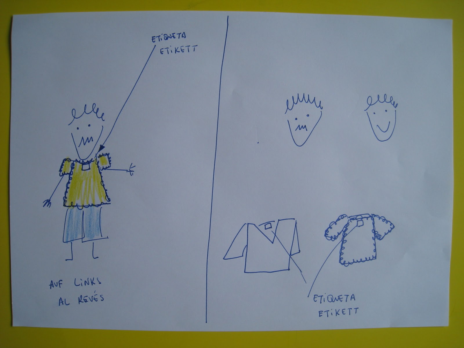 – ¿Está de la cara o está del revés? – El niño contesta “de la cara” – Genial (refuerzas) esta prenda está de la cara. Ponla ahora en la cesta de las prendas de la cara.